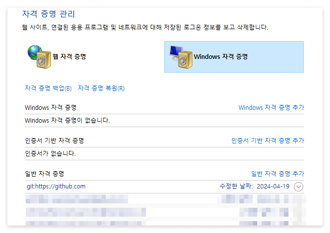 제어판 > 자격증명관리자 > windows 자격증명에서 github 자격증명이 되어있는지 확인할 수 있습니다.