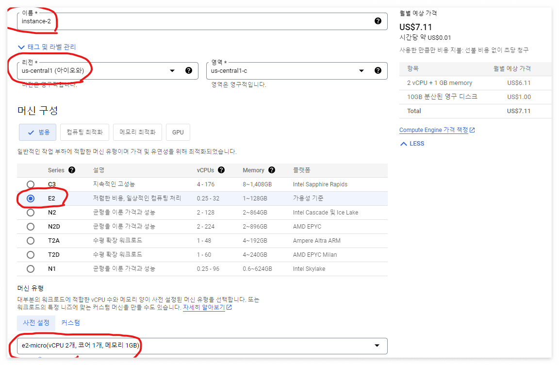 - 머신은 저가 e2-micro로 지정해줍니다.