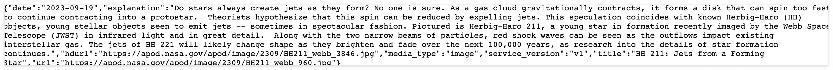 나사 오픈 api에서 받은 키 값을 넣어 url에 접속해 보면 아래와 같은 json 데이터를 확인 할수 있습니다. 그 json데이터 key값에 맞춰 SpaceData를 만들었습니다.