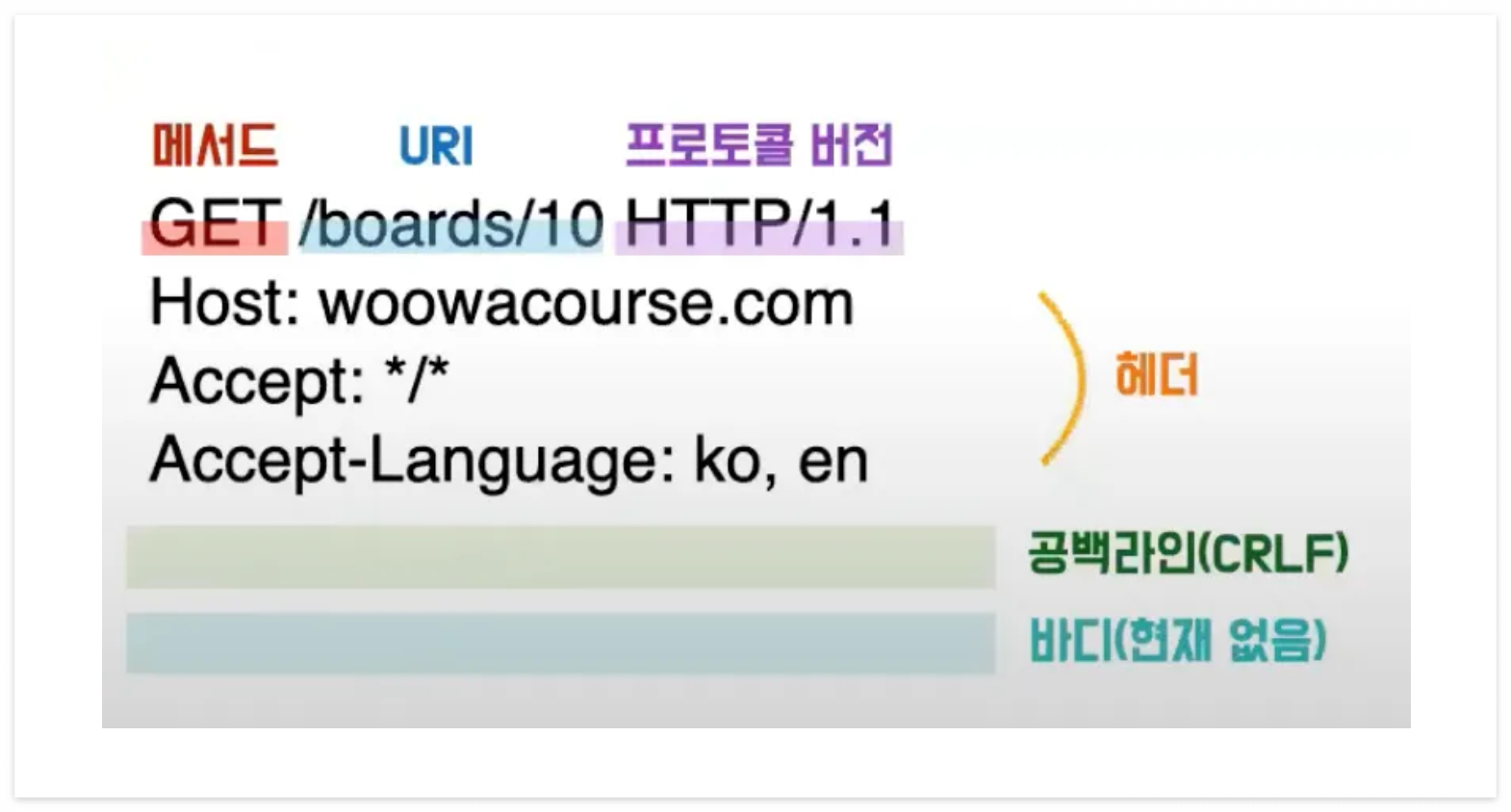- 요청은 메서드, URI, 프로토콜 버전, 헤더, 바디로 구성되어 있습니다.