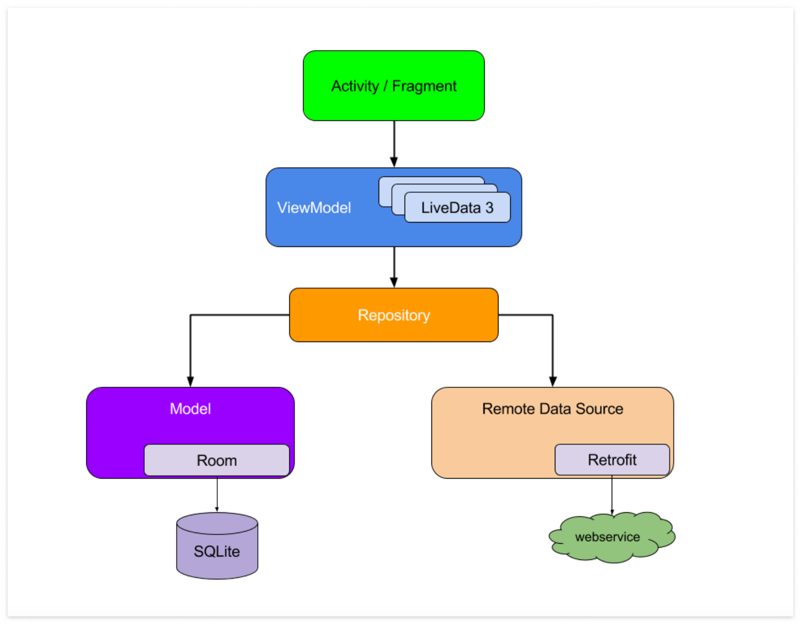뷰(Activity / Fragment)와 모델(Repository)이 분리되어 있고, 이 분리된 두 로직 사이에서 뷰의 이벤트에 따라 모델이 데이터를 반환/저장하도록 통신하는 뷰모델이 존재합니다.