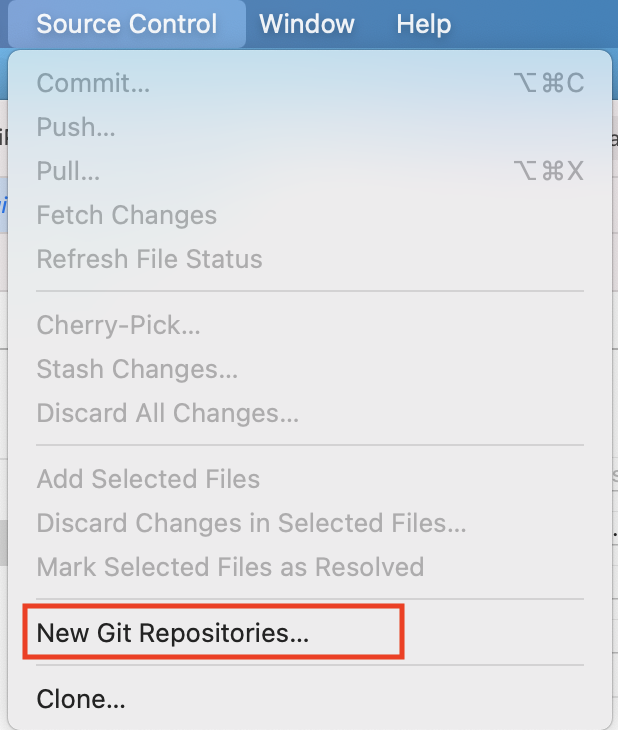 xcode Source Control탭의 New Git Repositories를 클릭한다. 클릭 후 대화상자가 뜨는데 Create를 눌러 진행해준다.
