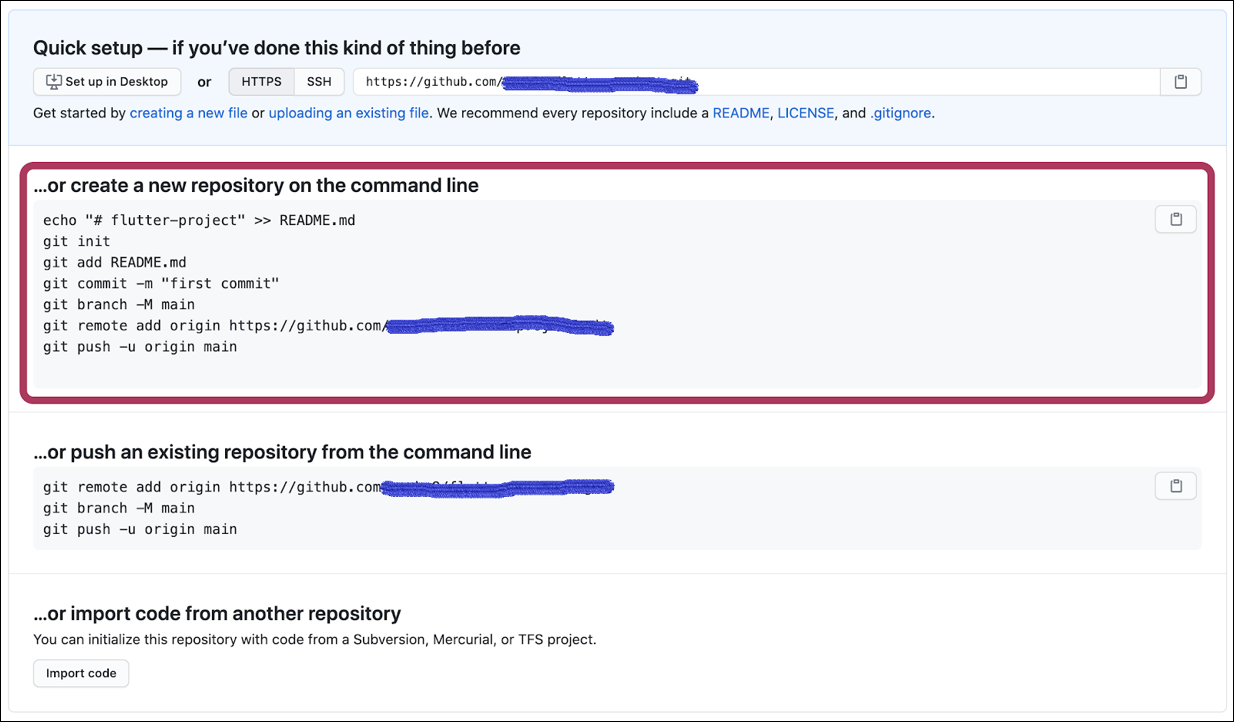 git Repository를 생성하면 local에서 push 할 수 있도록 명령어 메뉴얼이 나와있다.