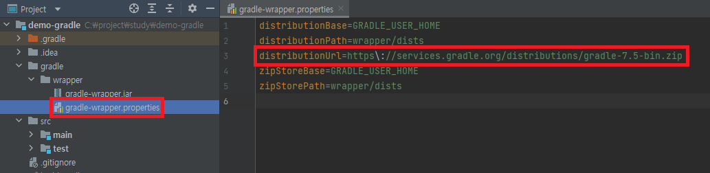 이제 gradle > wrapper > gradle-wrapper.properties 파일에 들어가서 버전을 확인해줍니다.