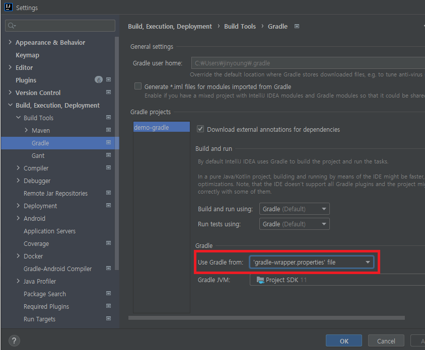 Use Gradle from 을 'gradle-wrapper.properties' file 을 선택해줍니다.