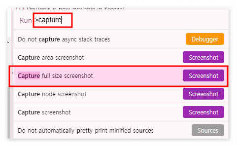 상단 검색에 capture라고 검색하여 Capture full size screenshot을 클릭해주면 해당 전체화면 스크린샷이 저장완료!