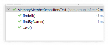 테스트한 findAll(), findByName(), save() 테스트코드가 정상 작동한것을 확인할수 있습니다.