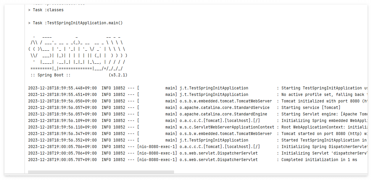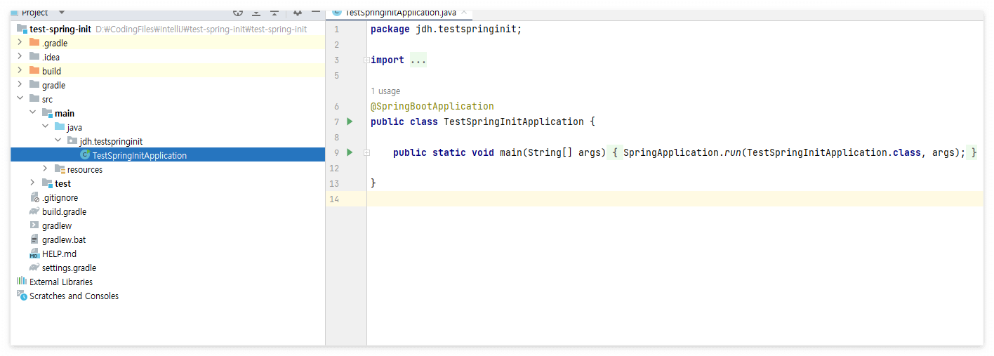 클래스 TestSpringInitApplication 은 메인클래스 입니다. @SpringBootApplication 으로 인해 스프링 부트의 자동설정, 스프링 Bean 읽기와 생성을 모두 자동으로 설정됩니다. 특히나 @SpringBootApplication 이 있는 위치부터 설정을 읽어 가기 때문에 이클래스는 항상 프로젝트의 최상단에 위치 해야만 합니다.