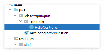 jdh.testspringinit 패키지 밑에 controller 패키지를 생성하여 HelloController 클래스를 작성 합니다.